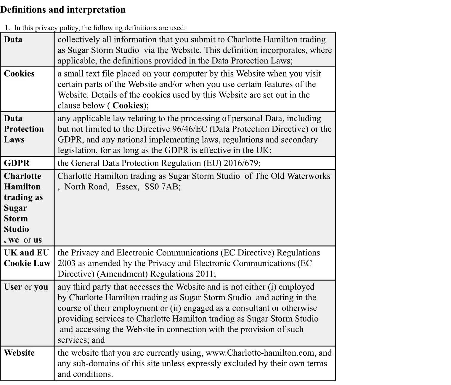 This privacy policy applies between you, the User of this Website and Charlotte Hamilton trading as Sugar Storm Studio , the owner and provider of this Website. Charlotte Hamilton trading as Sugar Storm Studio takes the privacy of your information very seriously. This privacy policy applies to our use of any and all Data collected by us or provided by you in relation to your use of the Website.