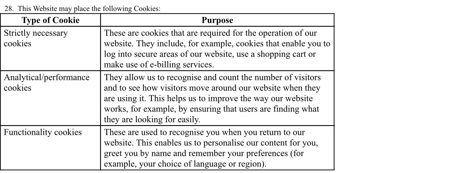 29. You can find a list of Cookies that we use in the Cookies Schedule.